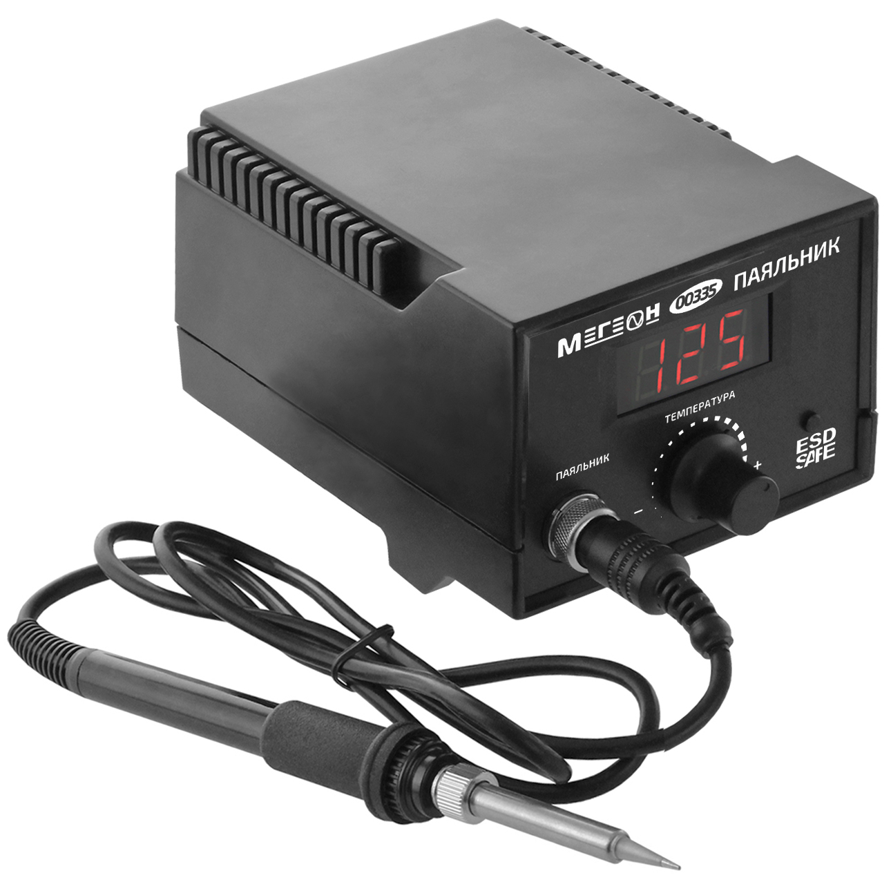 МЕГЕОН 00335 - это удобный паяльник с ярким светодиодным дисплеем и аналоговым регулятором установки температуры. Немаловажным преимуществом при работе с паяльником является маленький вес, мягкий провод и компактные размеры блока управления. На рукоятке предусмотрена резиновая накладка противоскольжения. Жало паяльника имеет распространённый типоразмер 900М-Т. Благодаря этому имеется большое количество сменных наконечников разной формы и размеров (в комплект не входят) для осуществления специфической пайки. В дополнение к написанному можно добавить ещё одно преимущество и это автоматическое поддержание установленной температуры паяльника. Для исключения повреждения радиокомпонентов статическим электричеством станция имеет функцию антистатической защиты. Прибор по достоинству оценят профессионалы и любители.