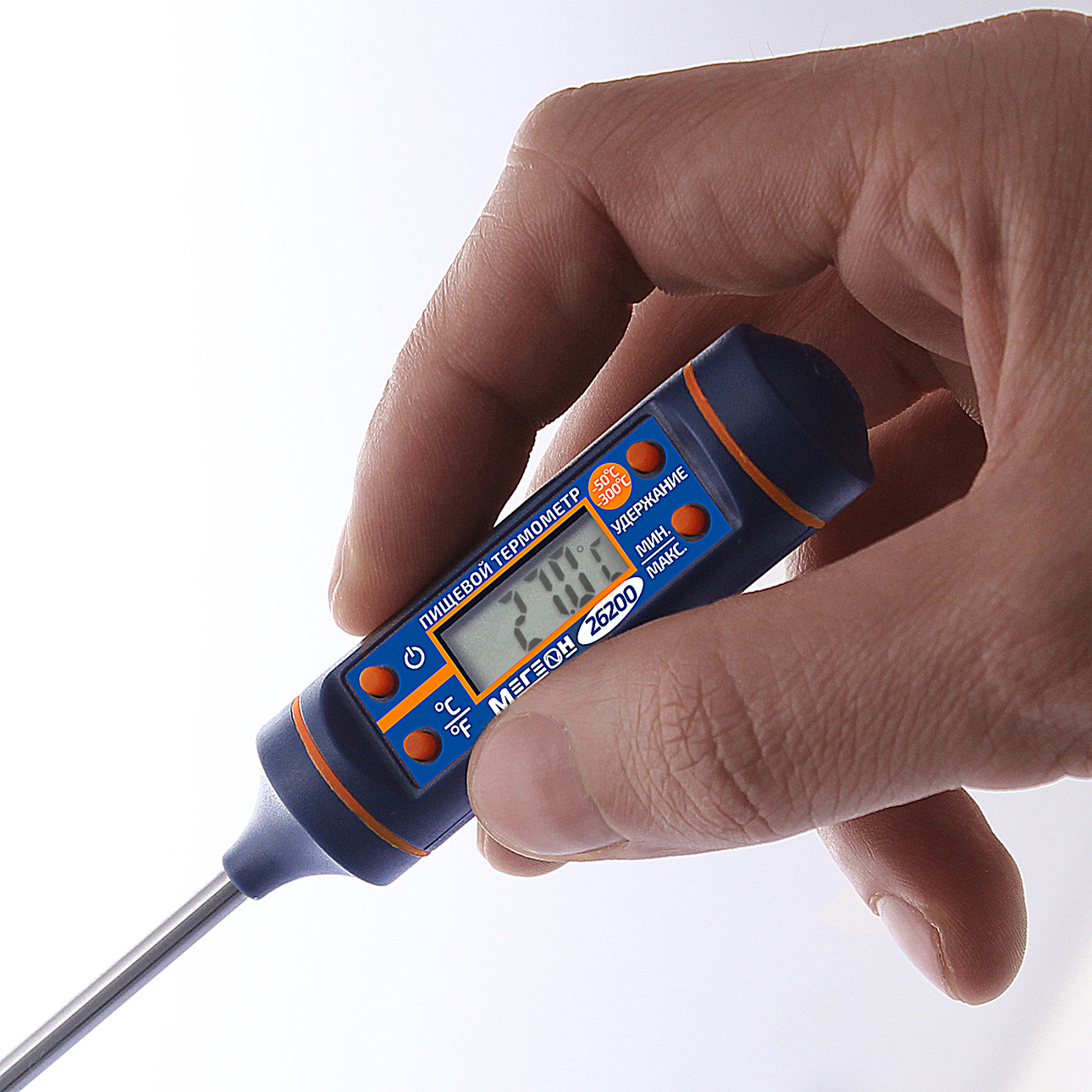 МЕГЕОН 26200 — это портативный контактный термометр с датчиком игольчатого типа, позволяющий измерять температуру с высокой точностью. Прибор имеет возможность ручного выбора единиц измерения и автоматического отключения после 10 минут бездействия и оповещения низкого уровня заряда элемента питания. Зонд изготовлен из нержавеющей стали, что обеспечивает прочность и долговечность изделия. Длина измерительной части 125 мм и диаметр 4 мм. Особенностью данной модели являются функции удержания показаний и отображения минимальных и максимальных измеренных значений. Изделие постоянно выполняет процедуру самодиагностики и в случае возникновения неполадок выдаст сообщение об ошибке на дисплее. Простота использования и функциональность сделают термометр незаменимым на кухне любой домохозяйки.